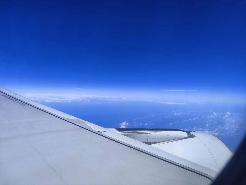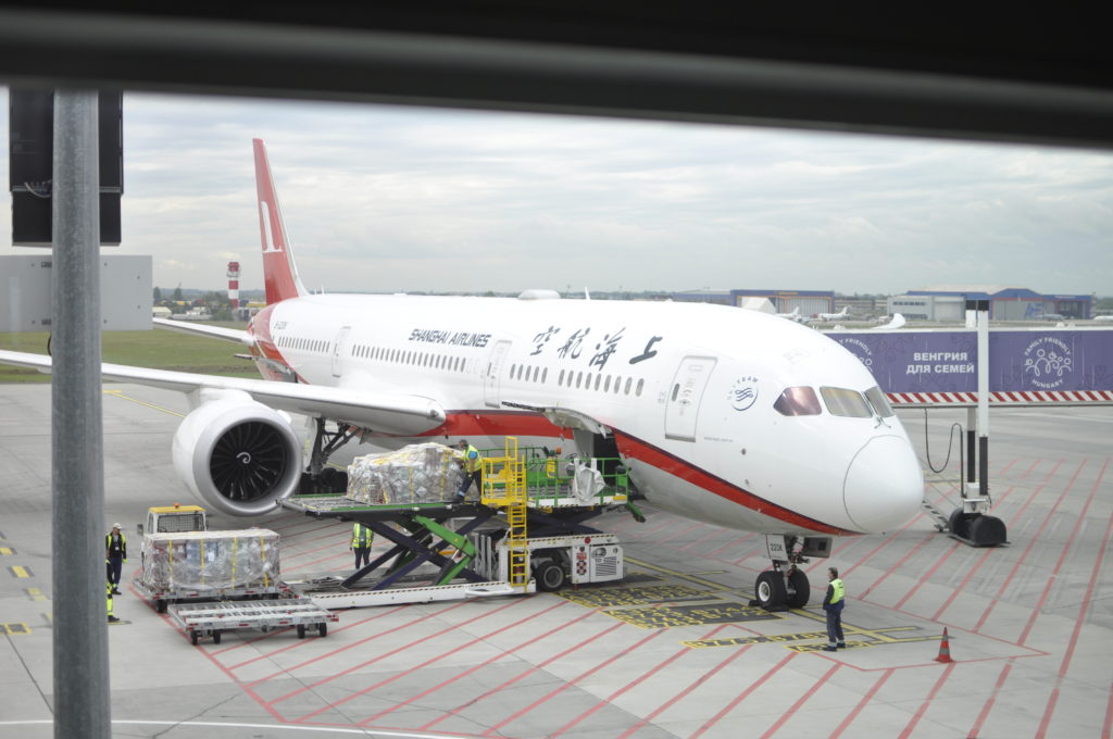 Moje lietadlo z Budapešti do Šanghaju. Miesta na nohy bolo veľa, ale pán sediaci vedľa potreboval nejak priveľa miesta pre svoje lakte. Čínska posádka bola fajn, čistili záchody každú hodinu. Jedlá boli dve veľké do Šanghaju a ešte jedno veľké do Tokya.
